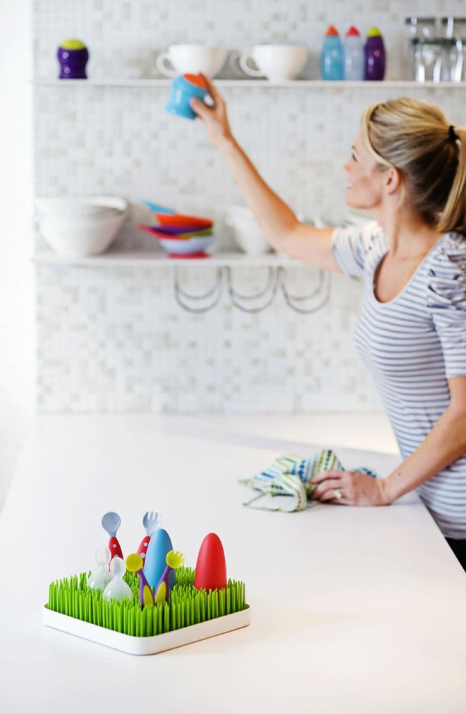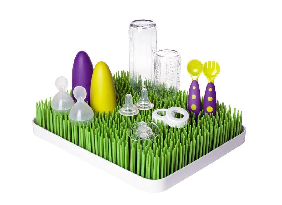 How cool is this drying rack. Dry bottles, teats, pump parts. The grass holds all your baby accessories as they air dry on the flexible blades, the water then drains into the lower tray, where it's completely contained.