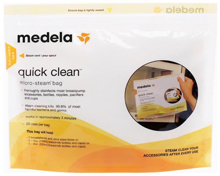 Medela Quick Clean Microwave Bags are designed for fast, safe and convenient steam cleaning of pump parts, bottles, teats and pacifiers.