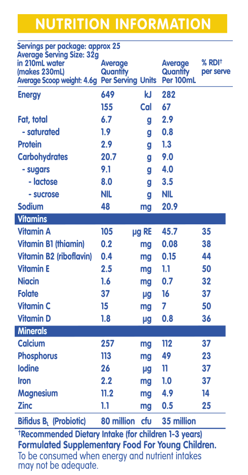 NAN OPTIPRO HA 3 Toddler milk is LIPID SMART, which means it contains a special blend of good fats. It also has no added sucrose to help support good eating habits. Just 2 serves per day of NAN OPTIPRO HA 3 Toddler milk provides your child with an average of at least 50% of the recommended dietary intake of calcium, iron, zinc, iodine and vitamins B1, B2, C, D and E.